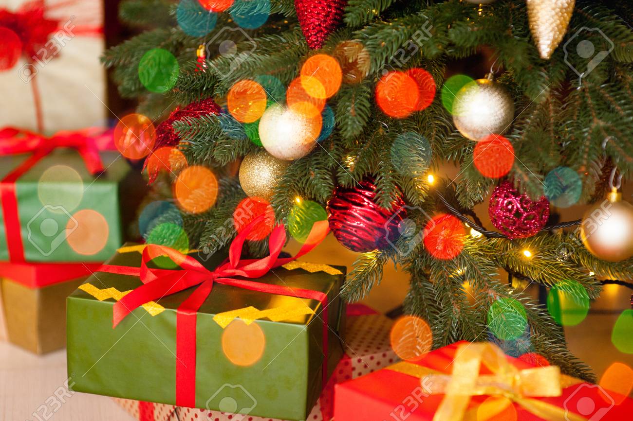Christmas tree 'skirts' started as christmas tree 'carpets'. Beautiful decorated living room with christmas tree with many presents under it in the winter holiday. Outdoor christmas decor for your home. How to decorate a beautiful christmas tree.